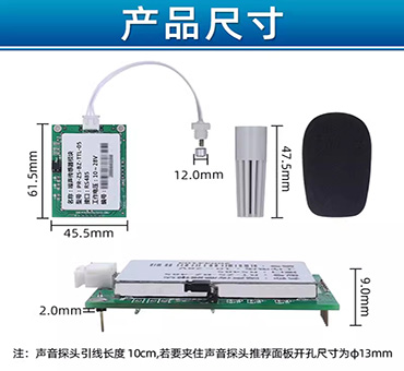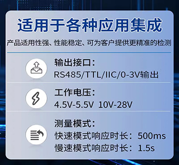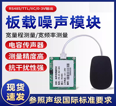 PCB板載安裝方式,30~130dBA寬量程、20~12.5KHz寬頻率測量,輸出接口TTL或RS-485出廠可選,供電電源4.5V~5.5VDC、10~28VDC可選。